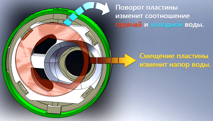 There is a special plate inside the mechanism, which, when turned, provides mixing of cold and hot streams of water. In case of displacement of this disc, a change in pressure occurs. On some cartridge models, a small roller may be installed instead of the plates. When the element rolls, it can close the hole with cold or hot water. The stem is an extension of the valve handle.