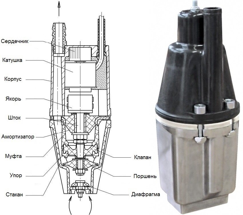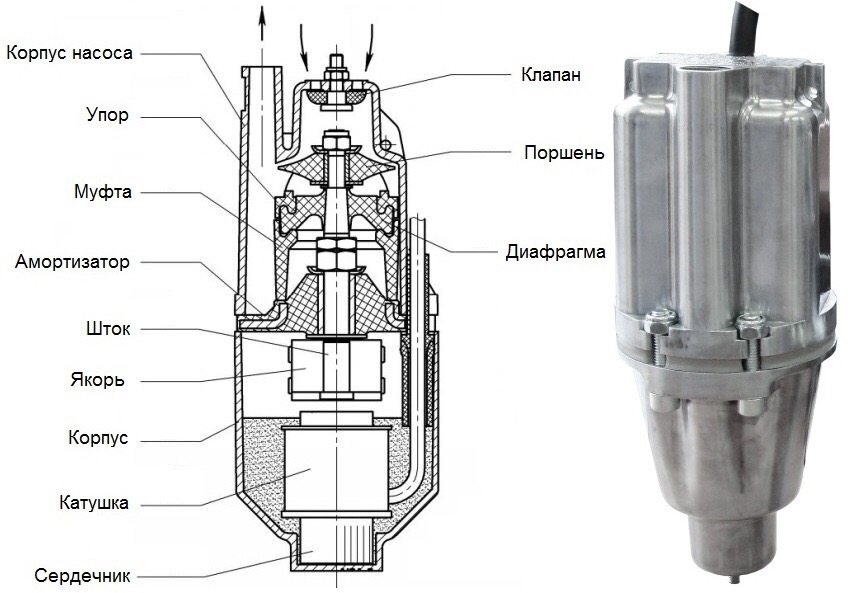 Like any other vibration pump, the Kid works on an inert principle - this means that there is a vibrator in its body, which gives the fluid vibrational movements. The vibrator is an anchor to which the stem is attached. When the pump is connected to the network, the armature is attracted to the magnet, then the magnet is turned off, and a special spring returns the armature with the rod to its original position. These vibrations occur approximately 50 times per second.