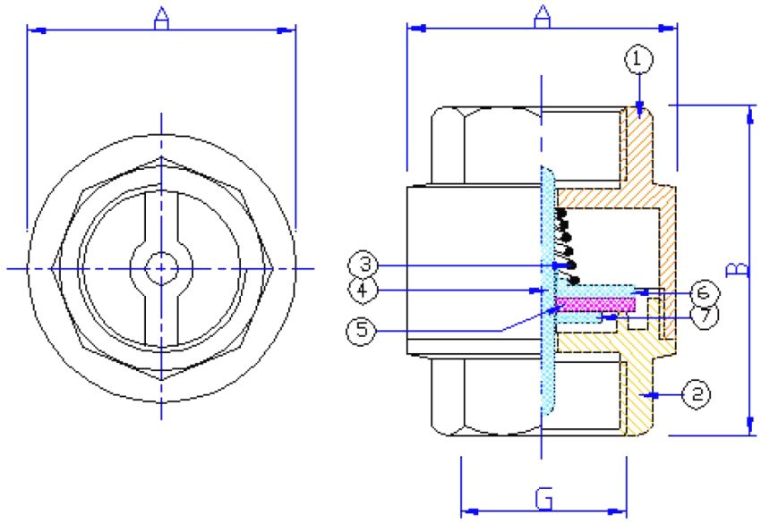 Dimensions and principle of operation of the coupling spring check valve: 1 and 2 - body; 3 - spring; 4 - plastic stem; 5 - sealant; 6 - top plate; 7 - bottom plate; A - 34.5-79 mm; B - 46-80.5 mm; G - 1 / 2-2 ″