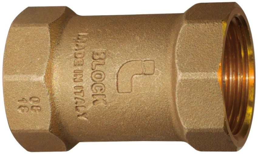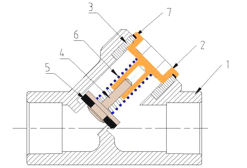 Spring check valve device with brass spool: 1 and 2 - nickel-plated brass body, 3 - movable spool, 4 - spring, 5 - brass spool plates, 6 - EPDM gasket