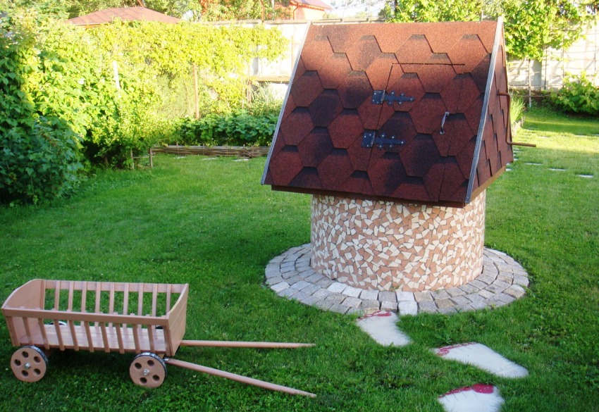 It is better to close the part of the plastic well that is above the surface. Direct sunlight can deform the rings, especially if they are thinner. You can imitate a log house if it is a drinking well. Brickwork will give an aesthetic look. The original canopy will protect from the effects of the sun and will become a design element of the site on which it is located.