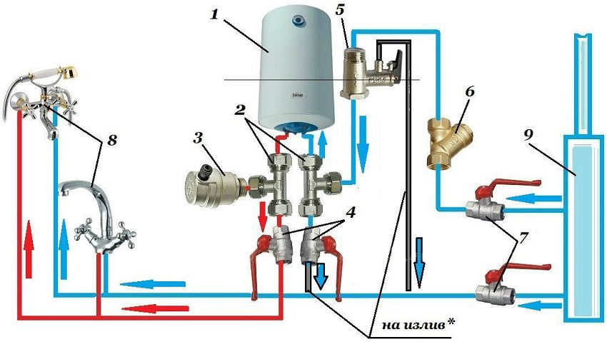 1 - electric storage water heater; 2 - tee; 3 - air intake valve; 4 - ball valve; 5 - safety valve; 6 - coarse water filter; 7 - shut-off valves; 8 - water consumers; 9 - cold water riser