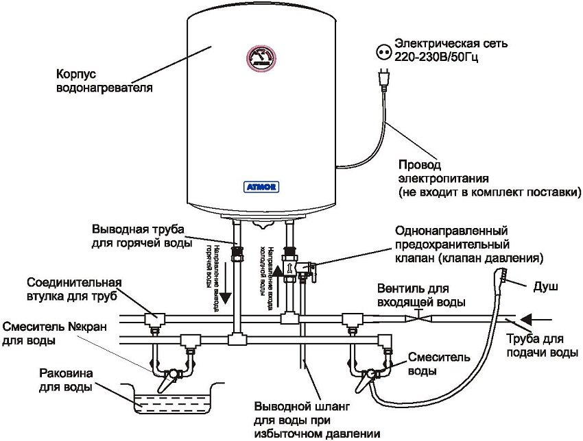 At its core, a flat storage water heater is a 50 liter tank, inside which there is a heater in the form of a metal tube with an electrical insulator. When the tap opens, and hot water is consumed from the tank, cold water immediately flows from the water supply to its place, while starting to heat up inside the tank.