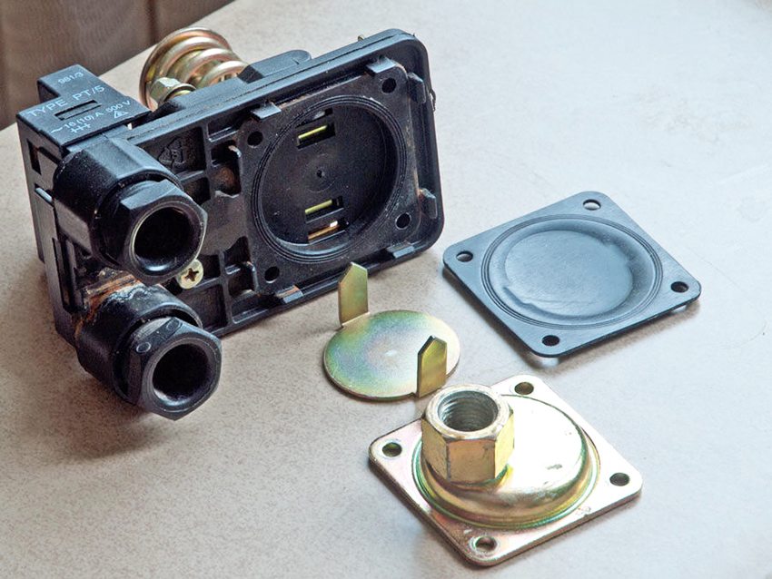 The electrical part of the water pressure switch is a two-contact relay for switching electrical circuits. The legs of the electrical contact assembly are sandwiched between the metal base plate and the plastic housing. Two clamps for clamping the cable (from the network and the pump power supply line) and the relay connection to the accumulator are located on the base of the plastic case.