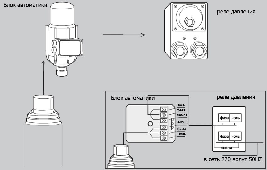 Before connecting the cable, remove the protective plastic cover from the device. The electrical cable of the supply line or pump is led into a suitable socket. Outside, the wire is fixed with a nut with a crimp plastic ring. The designation of the contact groups is indicated on the body. The end of the cable is divided into cores. Phase, neutral, grounding stripped of the insulating braid and connected to the terminals of the contact group.