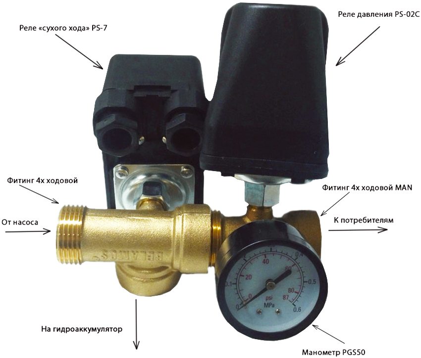 The pressure switch controls the operation of the pump and regulates the filling of the pneumohydraulic accumulator. The device integrates, controls and regulates the operation of the equipment of the cold water supply system.