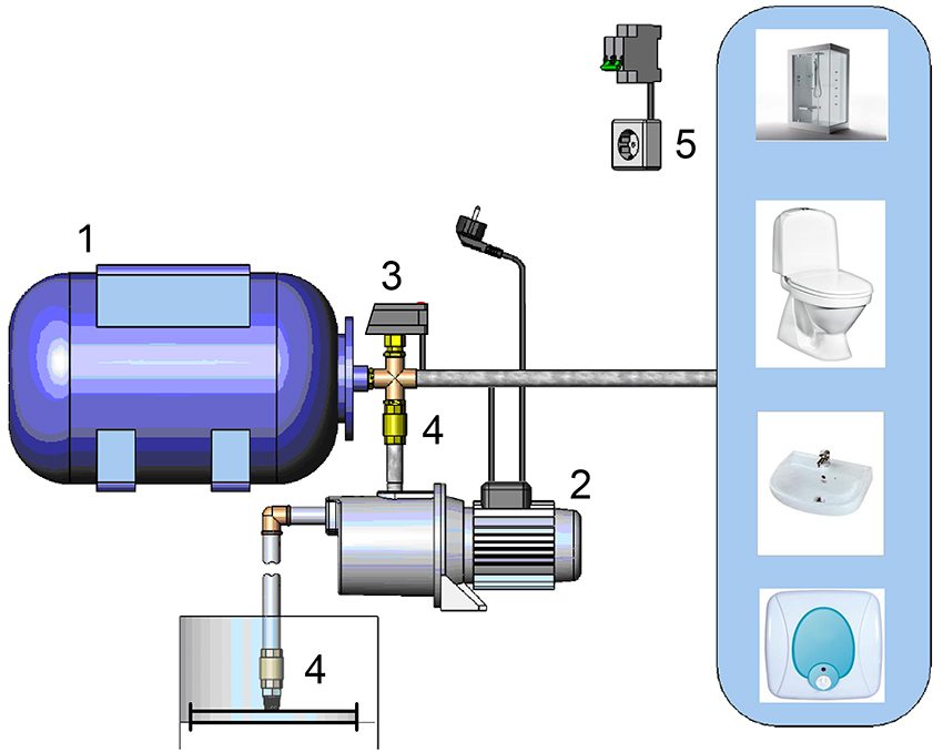 The water supply structure consists of: 1 - hydraulic accumulator; 2 - pump; 3 - pressure switch; 4 check valves; 5 - power supply