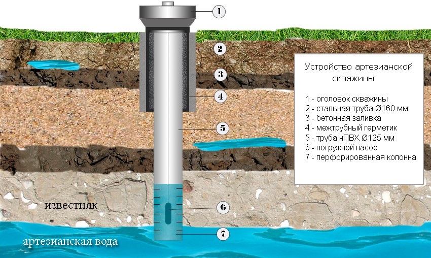 A diagram of the principle of operation of a well for water (sandy appearance) gives a visual representation of its internal structure.