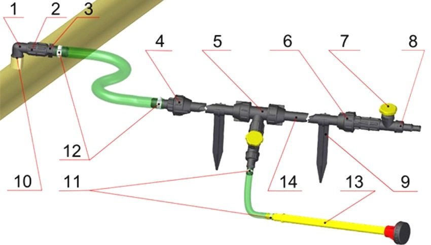 Installation diagram of a collapsible country water supply system: 1 - threaded angle, 2 - threaded coupling, 3 - adapter, 4 - transitional coupling, 5 - 90 degree tee, 6 - transitional coupling, 7 - tap, 8 - adapter, 9 - pipe count, 10 - O-ring, 11 and 12 - clamps, 13 - irrigation nozzle, 14 - 25 mm pipe