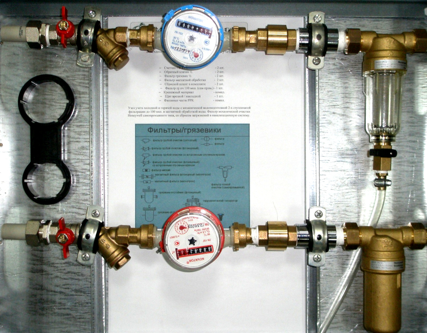The filter is also a required element of the node. Its function is to trap large particles that may be present inside the water supply system. Thus, a coarse filter is indicated in the installation diagram of the water meter.