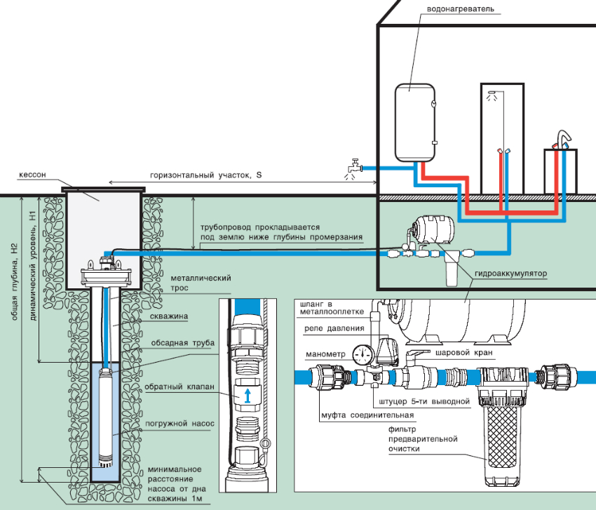 - 1 Water supply of a private house from a well: system diagram for a private house
