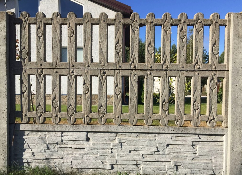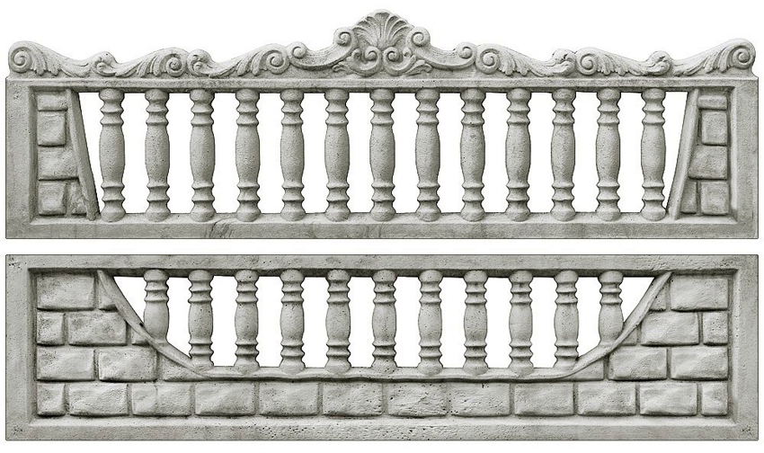 Type-setting concrete fences are distinguished by high decorative qualities. Each set consists of 2-4 elements measuring 50x200 cm, which are made in different variations of texture and color. They can be homogeneous, with imitation of stone, wood or brick, contain images and patterns. Plates can be blind or through with an ornament. The sections are produced with a matte or glossy surface.