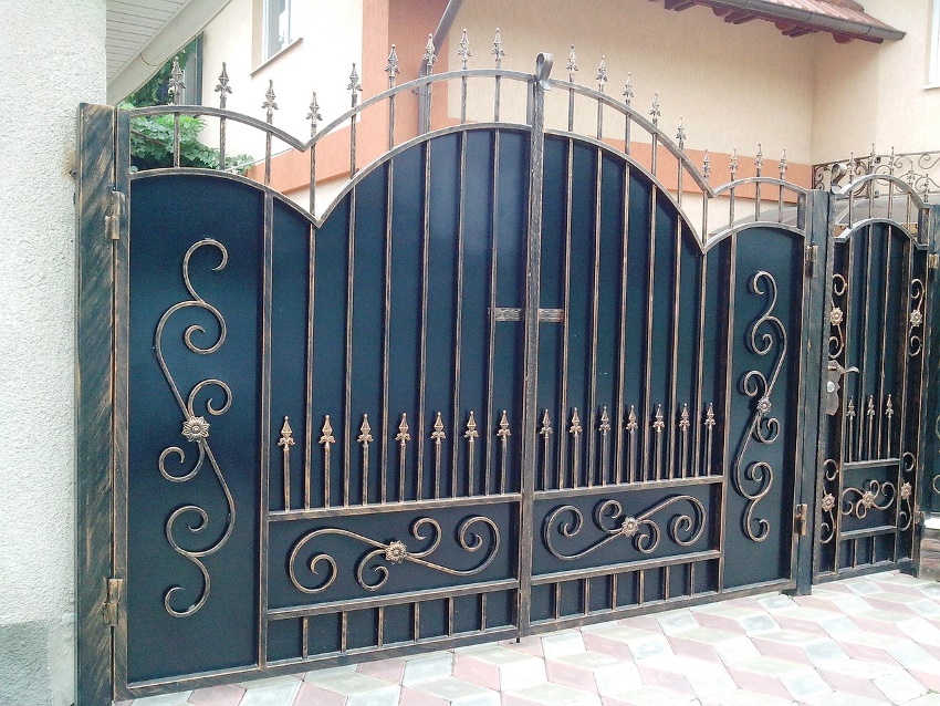 Closed structures... In addition to forged metal elements, blind gates include a protective sheet cover. The material for shielding such doors can be an ordinary metal sheet of any texture.