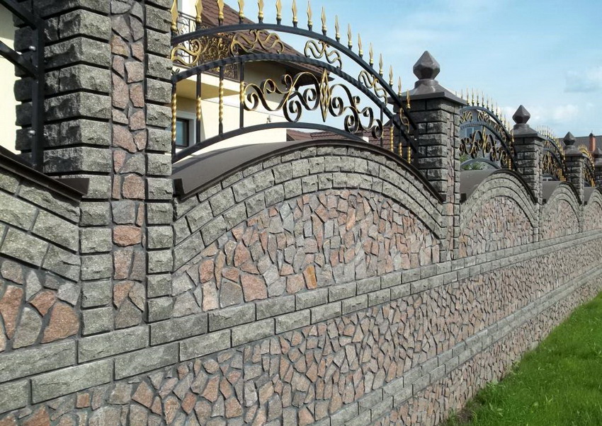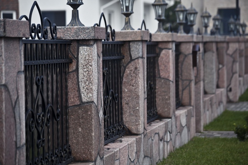 The combination of stone, forging and corrugated board is a good solution for creating a beautiful and reliable fence